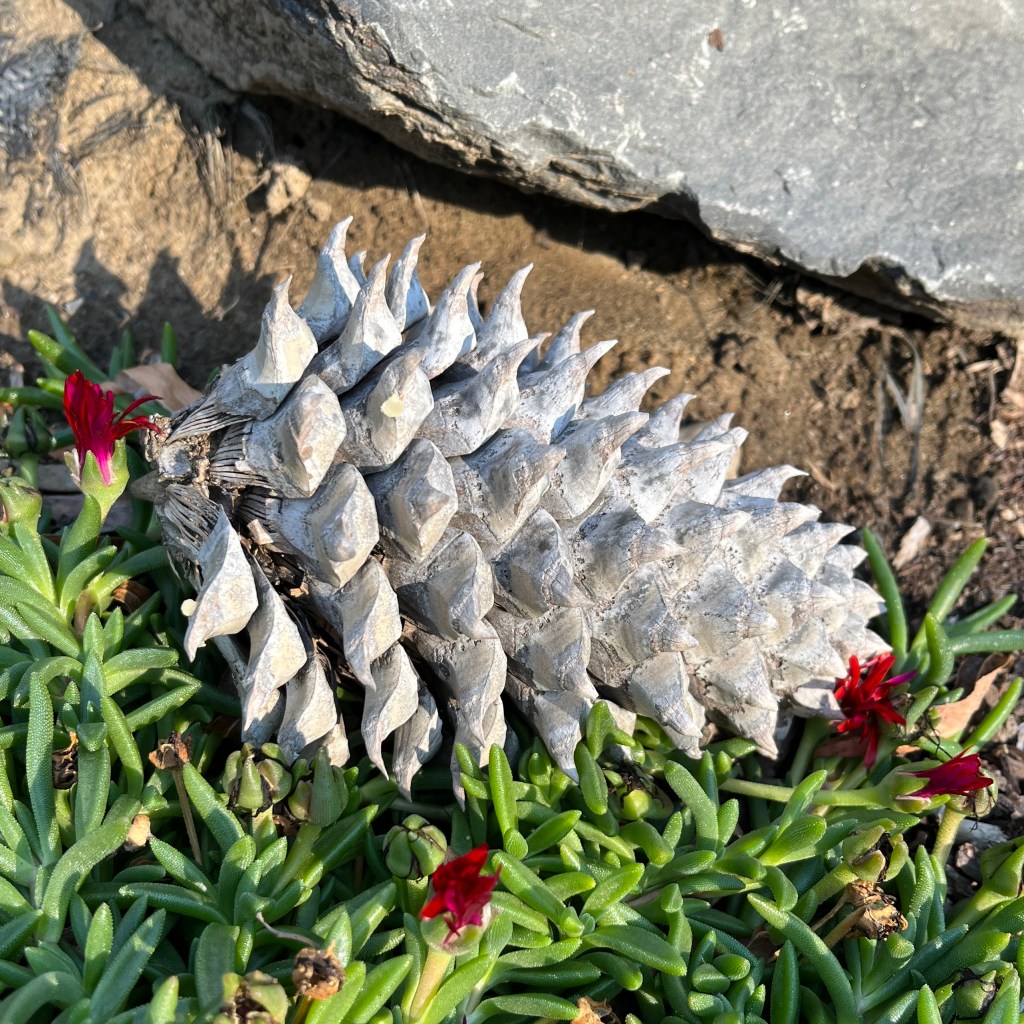 The Towani pine (Pinus sabiniana, aka gray pine, ghost pine, foothill pine) is also very much not from around here. I was walking by a house in my neighborhood and saw the cone in one of their flower beds. I couldn’t find the tree that it came from and it was the only one I saw (is it a decoration?), so I took a photo and moved on. (The Picture This! app says this cone is very dry, and the tree it came from might be dead.) Very cool cone, though, right?