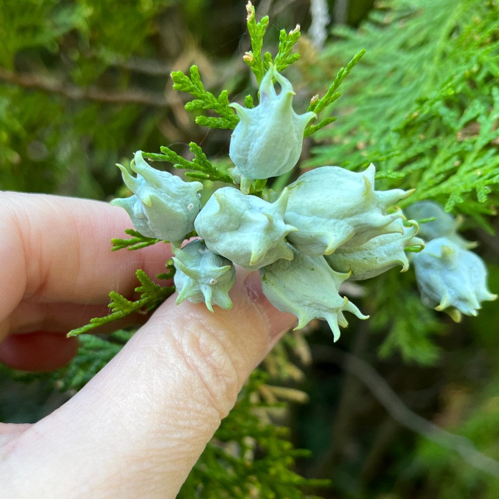 Chinese Thuja has distinctive cones — apparently it’s a member of the cypress family, but the only species in the genus Platycladus (binomial is Platycladus orientalis). Really not from around here, but apparently somewhat popular as a small landscape tree in my neighborhood.