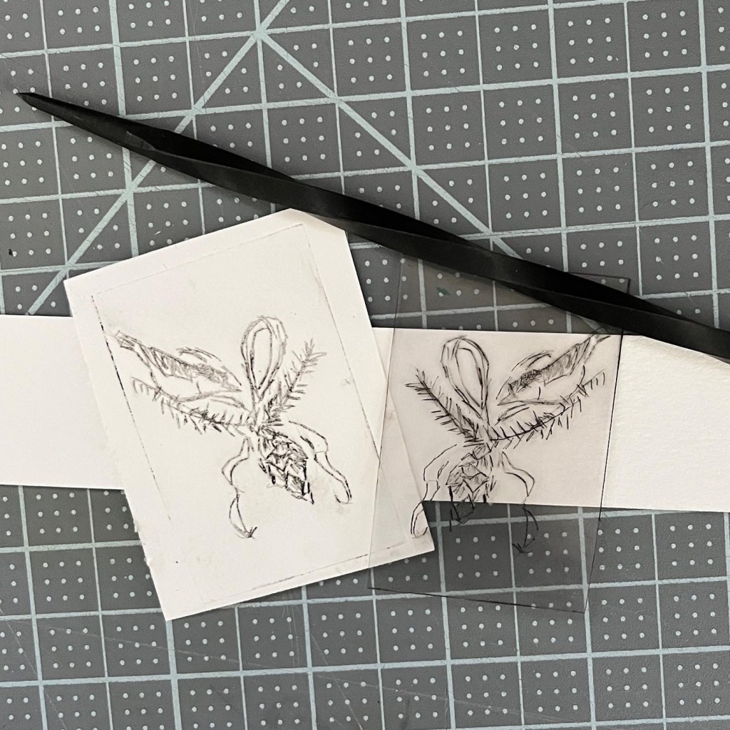 As I’m sure you can tell, I’m not an expert printmaker. And I don’t practice that often. I tried to do too much on my 4 cm x 6 cm plate, a sheet of heavy Dura-Lar. (I’m sure a competent printmaker could have pulled it off; I needed more space to to what I wanted to do.)