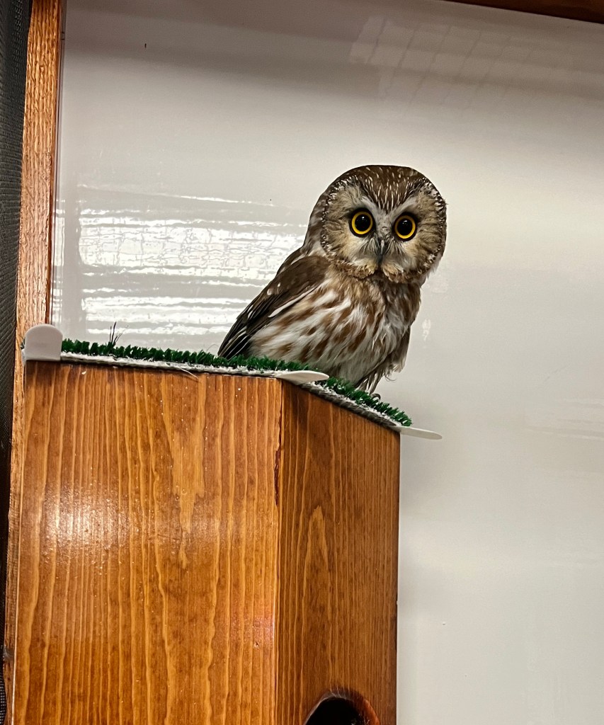 Saw-whet owl Basalt (recovered from Basalt Rd. in Spokane, WA) injured one of his shoulders in a window strike. His flight is compromised (he cannot gain altitude), and there is some speculation that he may have some mild neurological damage (though it does not manifest in his appearance or movement). He has been in care with his vet for the last several months while we waited for our federal permits and transfers to go through. We welcomed him to the OLC two weeks ago.