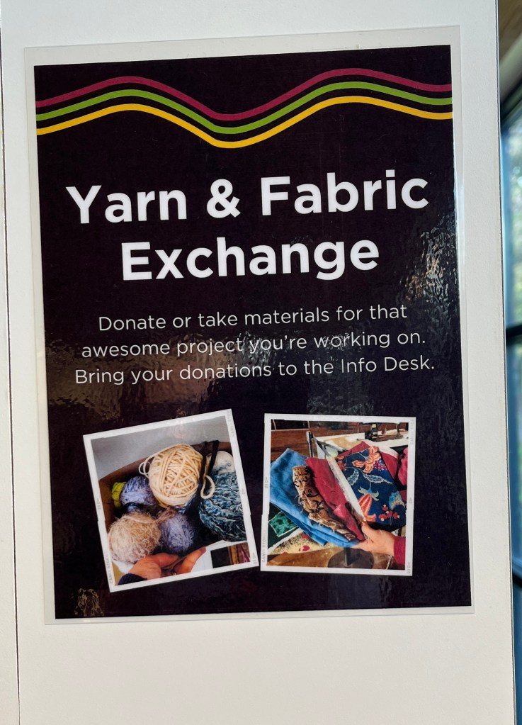 Anyone with a uterus can relate to the first; I can think of a few times when I would have benefited greatly from having access to free menstrual products, and I would have been profoundly grateful for them. The yarn and fabric exchange is just a great idea. I think I have some fabric (and probably yarn) I can donate…