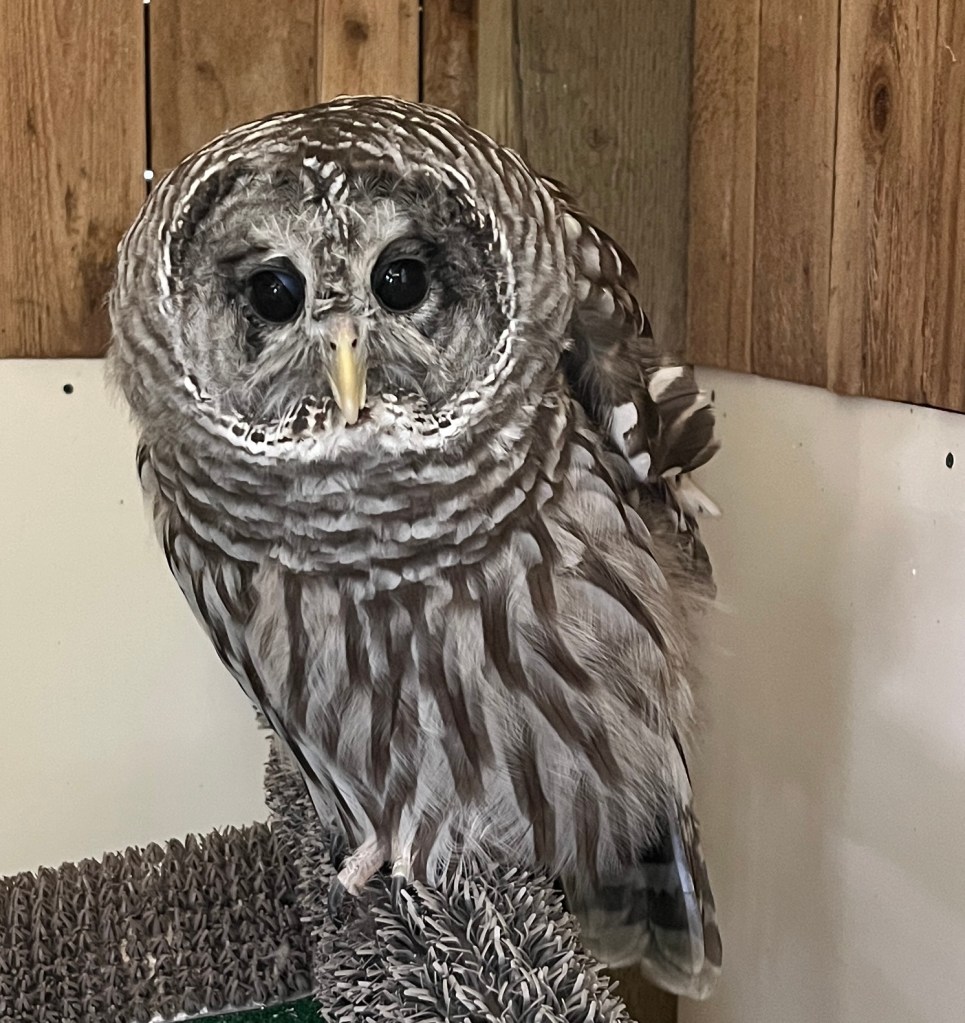 He came to the West Valley Outdoor Learning Center in, I think, 2011. (I started in early 2012, and he was in a starter mew then.) He could not fly, but by every other metric, he was a classic barred owl, which is to say, he was deceptively aggressive. Got too close to him? He’d jump at your head. Stand up too quickly near him while cleaning? Jump at your head. Try to retrieve cached mice in his mew? Lunge at your hand. Collect him on the glove? Gnaw aggressively at your hand. Trimming his beak? Snap at your fingers. (The only black eye I’ve ever had came from one of Oroville’s launches.)