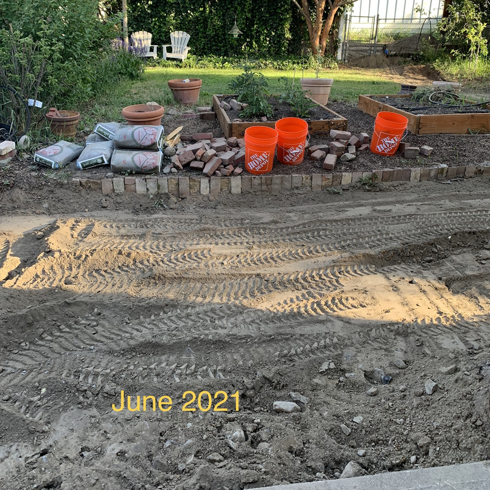 The problem: there was no underlayment. It was brick on dirt (not soil — just sandy, mostly dead dirt). We started digging out, expanded the area outward by getting rid of a skinny bed with leggy roses in it. We took out a poorly laid concrete pad. It was a very slow, labor-intensive, time-consuming situation that we couldn’t get done in July and August (because HOT!), which led to an awkward winter.