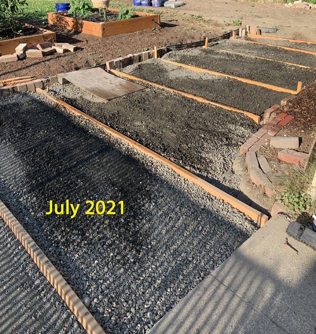 Dana just finished with the gravel — he added another few inches after that last photo was taken. It has been tamped. One more pass to make sure it’s level where it needs to be, and then he can start the sand and pavers (which were delivered two weeks ago).