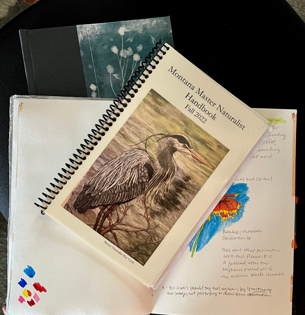 Montana Master Naturalist handbook, sitting on top of my nature journal, which is sitting on top of a handmade blank book for note taking.